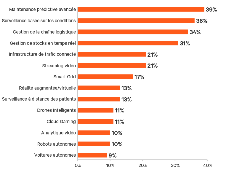 La réduction des temps d’arrêt des équipements de fabrication et l’optimisation de la chaîne logistique ont constitué les cas d’utilisation les plus populaires ayant entraîné des investissements Edge. La maintenance prédictive était le principal cas d’utilisation cité par les participants (39%) suivi de la maintenance basée sur les conditions (36%), de la gestion de la chaîne logistique (34%) et de la gestion de stocks en temps réel (31%) (Figure 8).