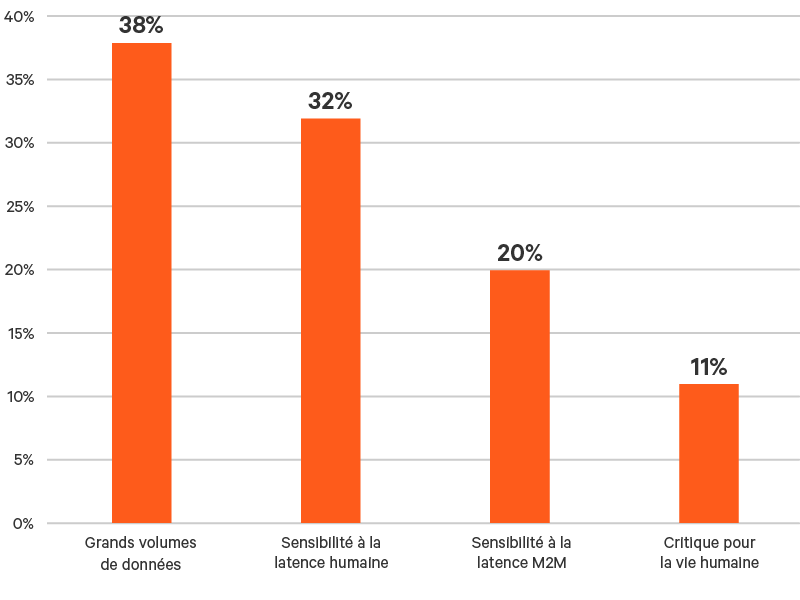 - Les cas d’utilisation de type Sensibilité à la latence machine à machine requièrent généralement une latence encore plus faible que les cas d’utilisation Sensibilité à la latence humaine, en raison de la vitesse à laquelle les machines peuvent traiter les données. Les cas d’utilisation clés dans cette catégorie comprennent les réseaux électriques intelligents et les systèmes de sécurité intelligents. Un participant sur 5 (20%) a déclaré que ses investissements dans la technologie Edge étaient motivés par des cas d’utilisation de type Sensibilité à la latence machine à machine.